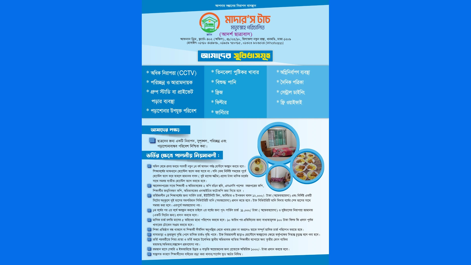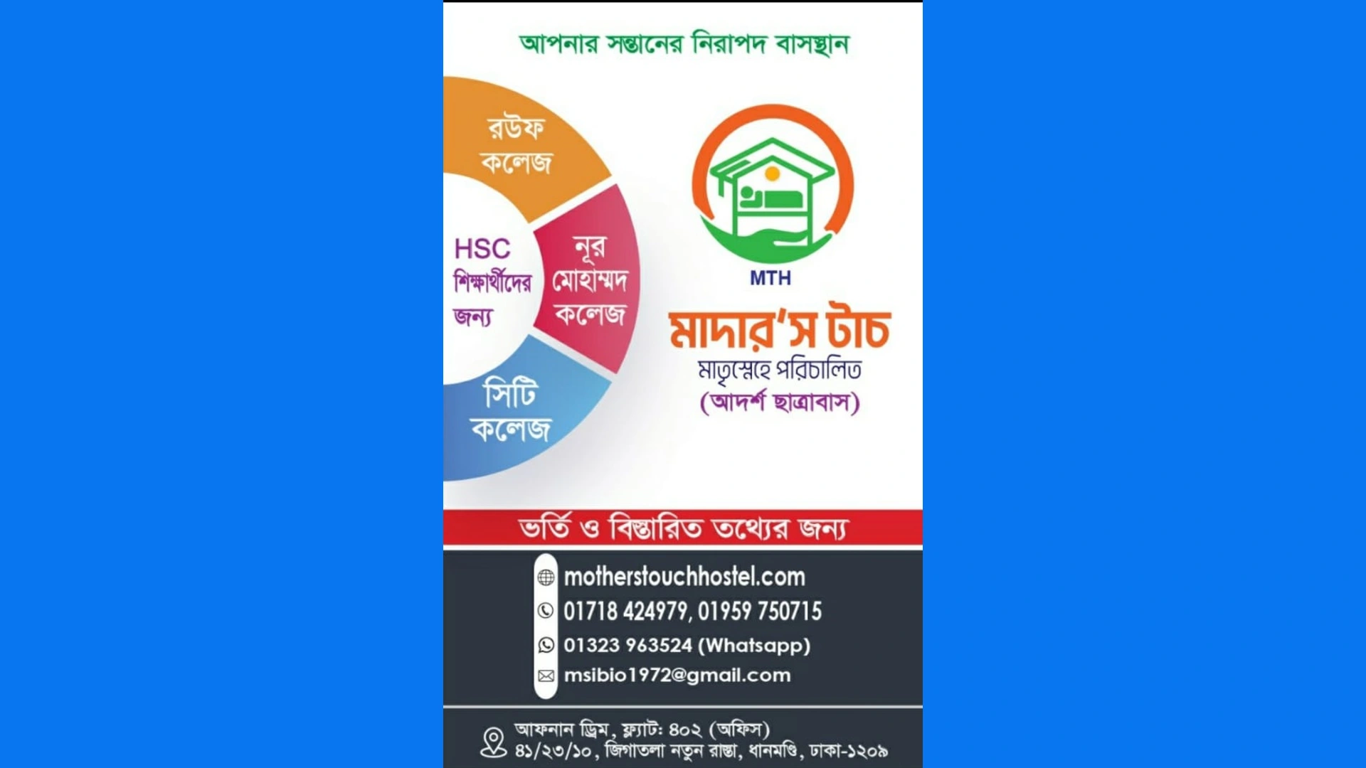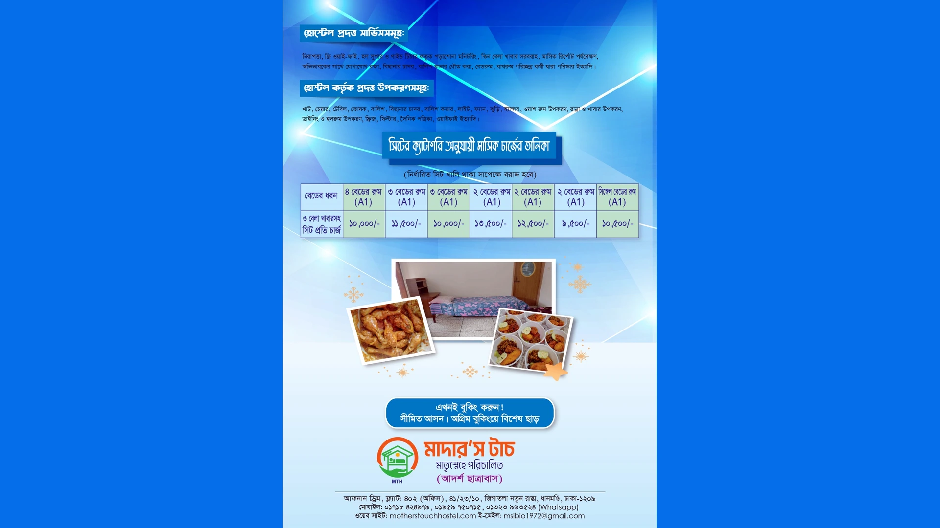 বিসমিল্লাহির রাহমানির রাহিম আসসালামু আলাইকুম। মাদার’স টাচ হোস্টেলে আপনাকে স্বাগতম । মাদার’স টাচ হোস্টেলের সাথে জড়িত শিক্ষক, কর্মকর্তা, কর্মচারী, সম্মানিত অভিভাবক,বর্তমান ও প্রাক্তন ছাত্র সবাইকে আন্তরিক শুভেচ্ছা ও অভিনন্দন। শিক্ষকদের নিরলস প্রচেষ্টা,নিবেদিত আত্মত্যাগ এবং সম্মানিত অভিভাবকগণের আন্তরিক বিশ্বাস ও সহযোগিতা আমাদের প্রতিনিয়ত পথচলাকে উৎসাহিত করছে । বাংলাদেশের বিভিন্ন প্রান্ত থেকে আগত শিক্ষার্থীদের কল্যাণের মহান উদ্দেশ্য নিয়ে পথচলা শুরু করে । হাঁটি হাঁটি পা পা করে সাফল্যের সাথে পৌঁছেছে সাফল্যের স্বর্ণশিখরে। আমার স্বপ্নের সমাদার’স টাচ হোস্টেল মানব গড়ার প্রতিষ্ঠানটি কলেজের অভিভাবকদের কাছে একটি নির্ভরতার ছায়া ।মাদার’স টাচ হোস্টেল প্রথাগত হোস্টেলের সীমাবদ্ধতা পেরিয়ে একটি আদর্শ হোস্টেলের মডেল হিসেবে দাঁড়িয়েছে। মাদার’স টাচ হোস্টেলে আমরা ছাত্রদের দিচ্ছি এমন সব সুযোগ-সুবিধা যা আপনার সন্তানকে হোস্টেলে থেকেও দেবে নিজের বাড়ির অনুভূতি।ছাত্রদের পড়ালেখার জন্য যেমন চাই ভালো মানের কলেজ ঠিক তেমনি থাকার জন্য চাই সেরা মানের হোস্টেল।
